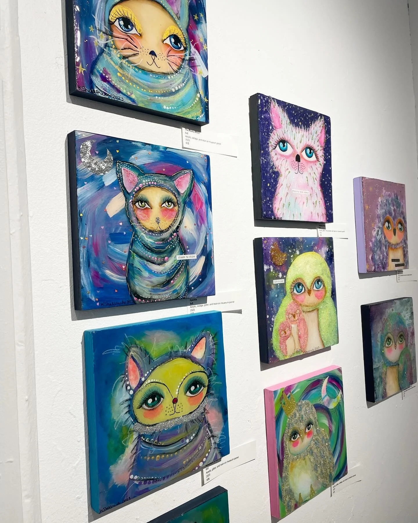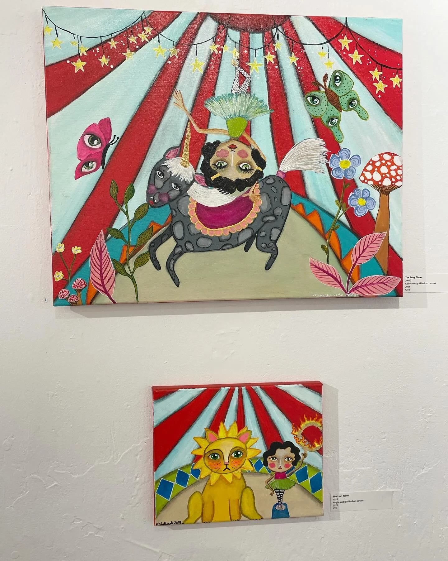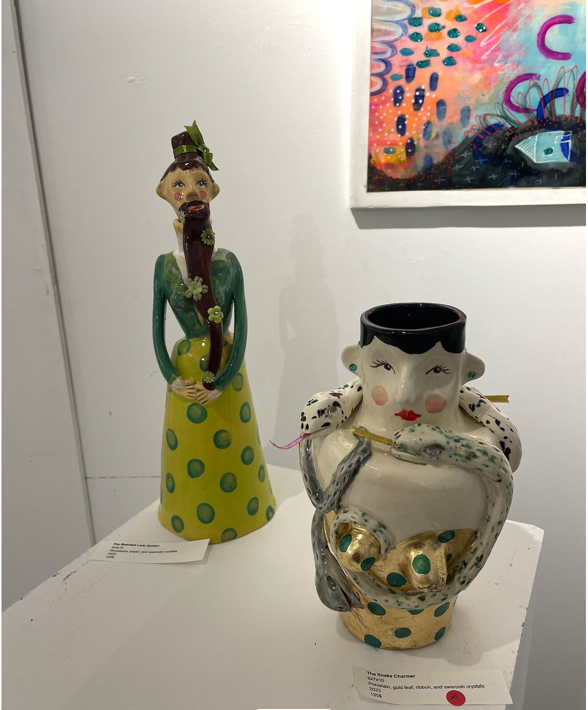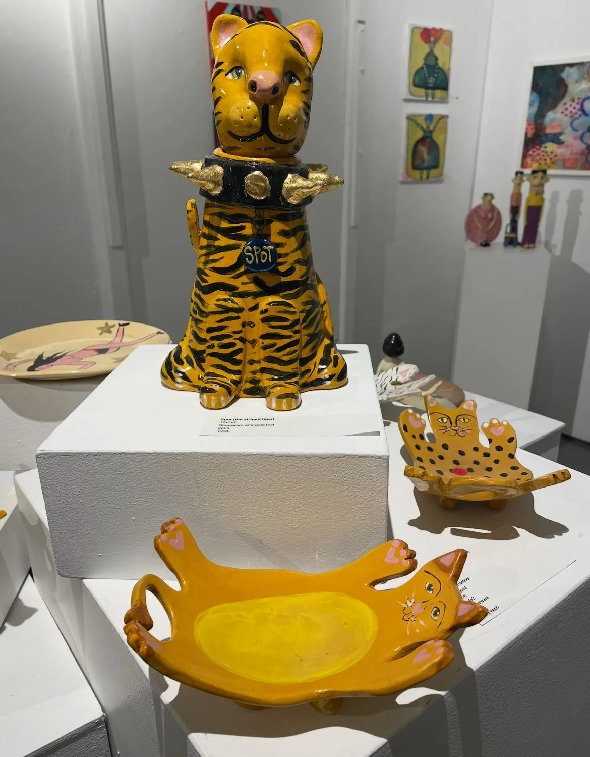 Each ceramic creation assumes a unique, functional form. From the whimsical elephant-shaped teapots to fortune-telling piggy banks, no two pieces are alike. The vibrant hues and abstract shapes of the paintings burst like fireworks for the eyes. Meanwhile, the smaller paintings, rendered in acrylics, gold leaf, glitter, and resin, transport you to a dreamlike and whimsical realm.