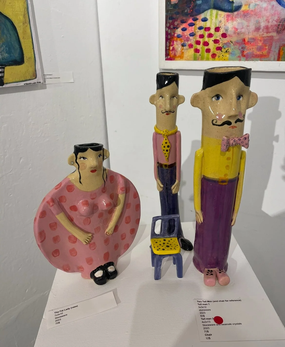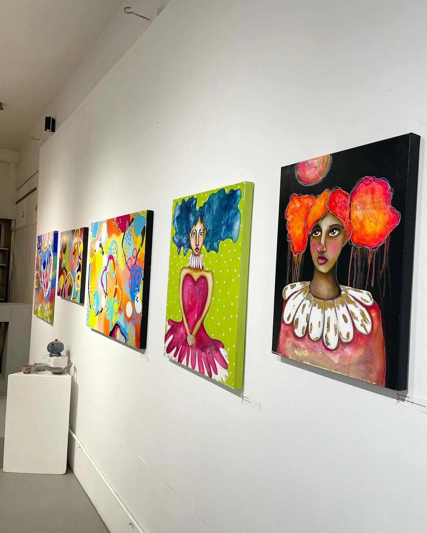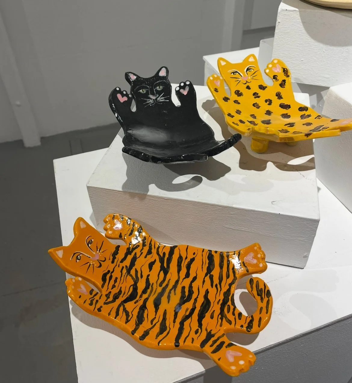 Each ceramic creation assumes a unique, functional form. From the whimsical elephant-shaped teapots to fortune-telling piggy banks, no two pieces are alike. The vibrant hues and abstract shapes of the paintings burst like fireworks for the eyes. Meanwhile, the smaller paintings, rendered in acrylics, gold leaf, glitter, and resin, transport you to a dreamlike and whimsical realm.