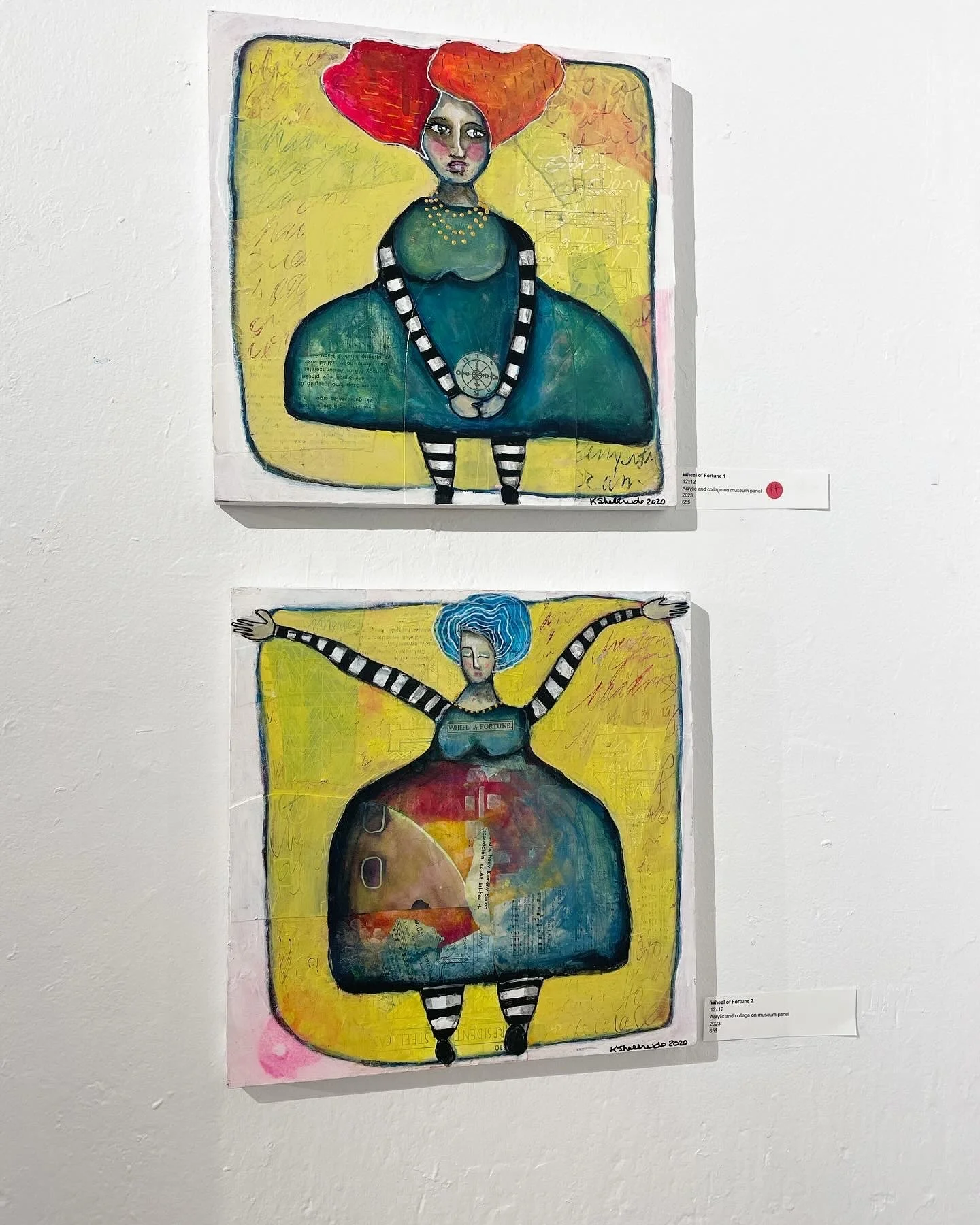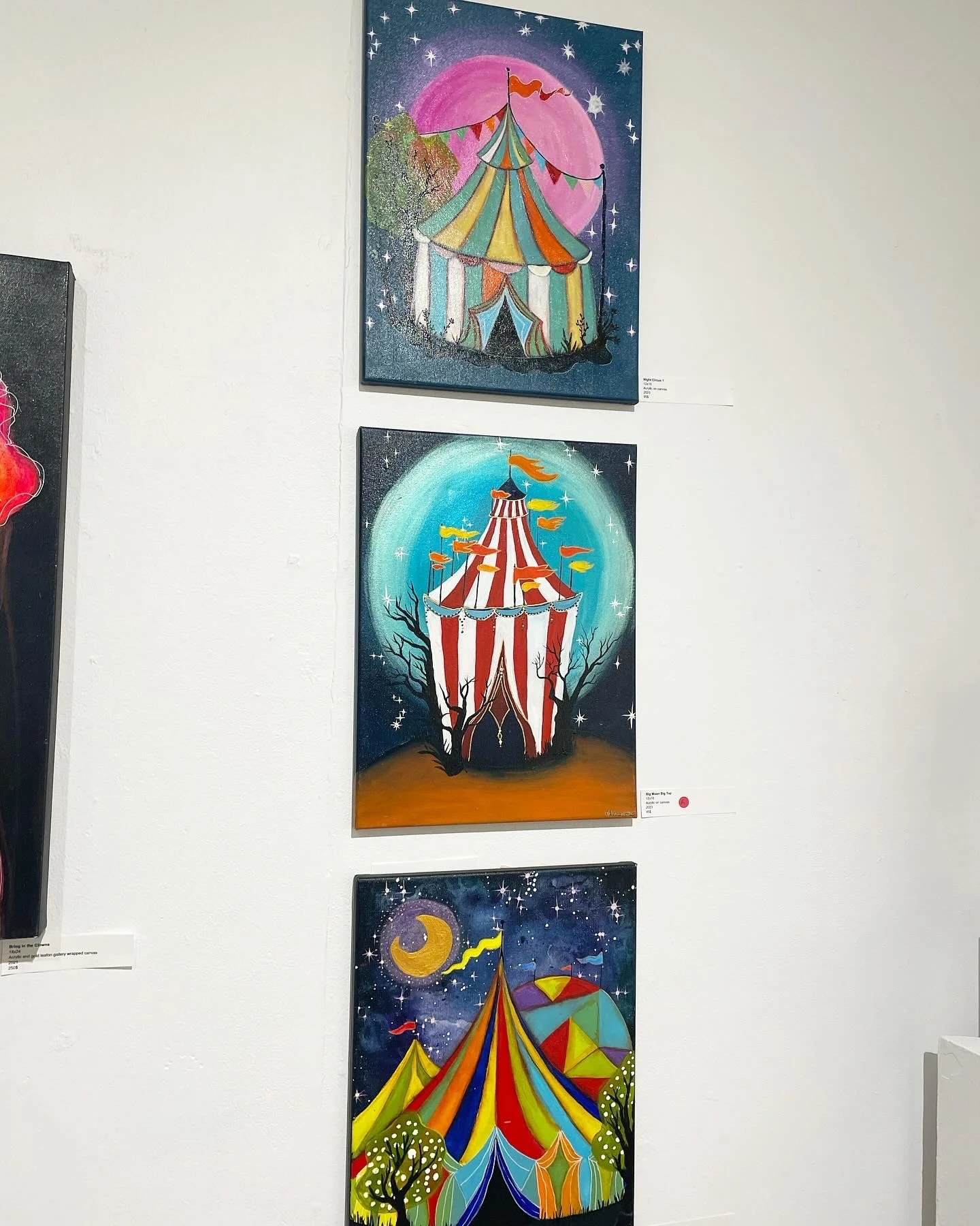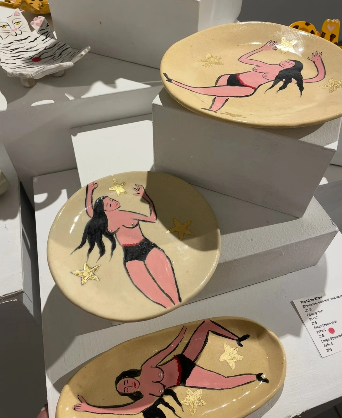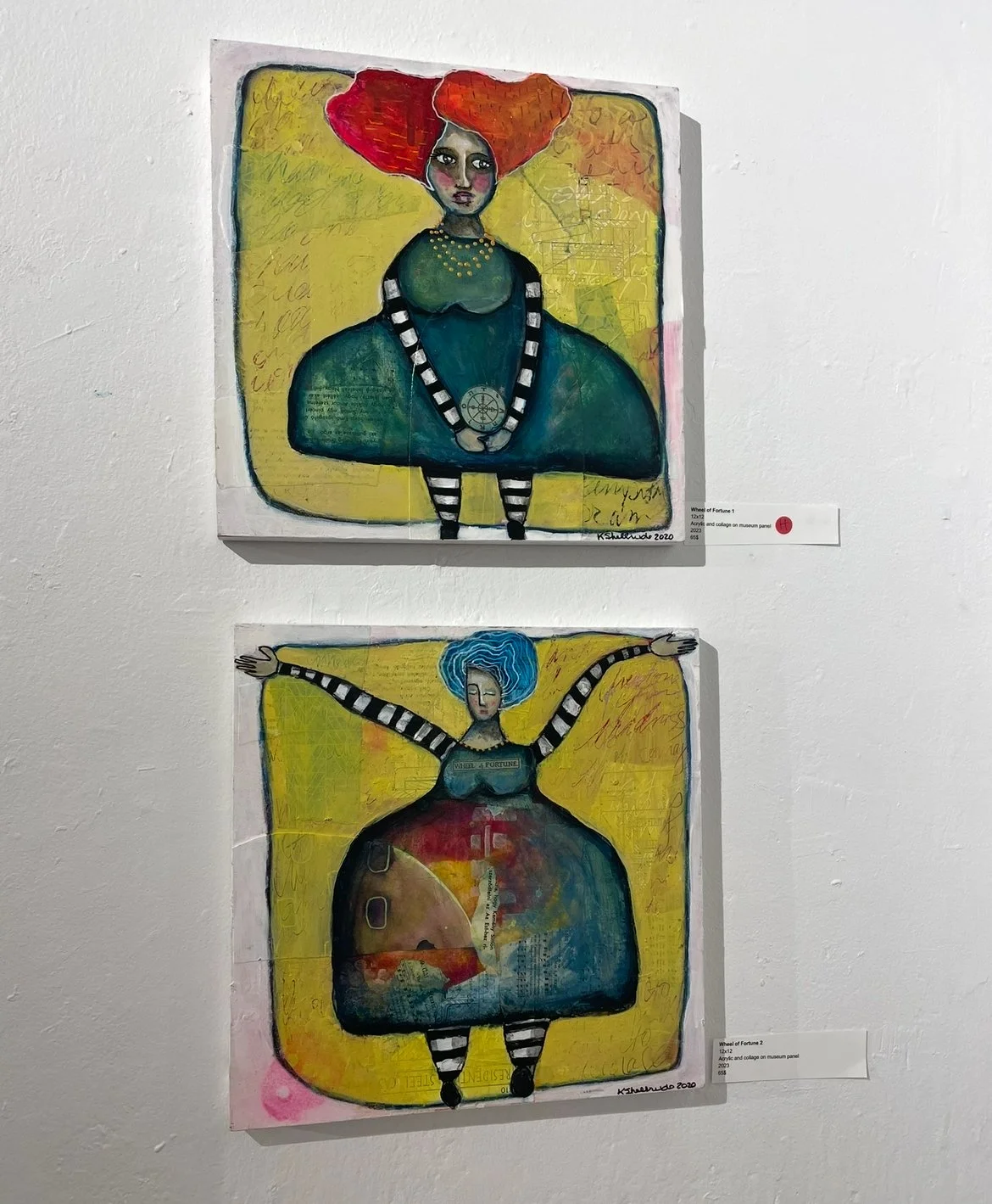 Each ceramic creation assumes a unique, functional form. From the whimsical elephant-shaped teapots to fortune-telling piggy banks, no two pieces are alike. The vibrant hues and abstract shapes of the paintings burst like fireworks for the eyes. Meanwhile, the smaller paintings, rendered in acrylics, gold leaf, glitter, and resin, transport you to a dreamlike and whimsical realm.